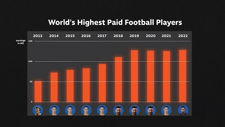 Впервые за десять лет самыми высокооплачиваемыми футболистами в мире является ни Роналду, или Месси, а Мбаппе, который громко вырвался на первое место - став самым высокооплачиваемым футболистом в истории.