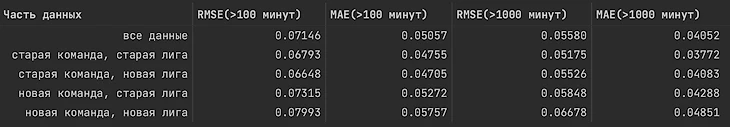 Давайте посчитаем RMSE и MAE между значениями PRR в следующем и в предыдущем сезонах. Только разобьем ошибку в зависимости от сыгранных минут и от того, менял ли игрок команду/лигу.