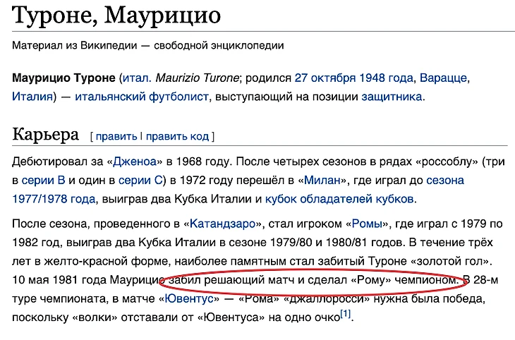После трансляции, в 0-05 (время – московское) на канале RAI 1 покажут документальный фильм «Er gol de Turone era bono», посвященный легендарному голу защитника «Ромы» в ворота «Ювентуса». История произошла на финише чемпионата 1980/81, гол не был засчитан, «бьянконери» взяли скудетто. Как видите, в википедии страсти не утихли до сих пор.