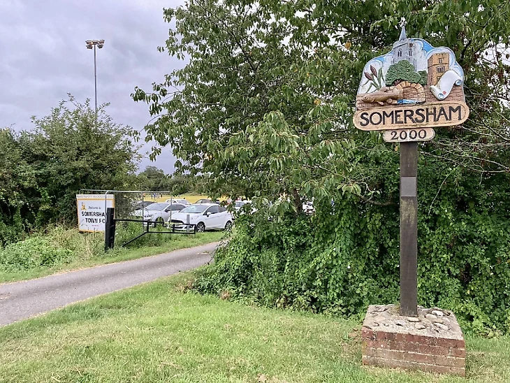 На въезде в еще одну деревеньку под названием Сомершем. Стадионы возле знаков — отдельная графа для граундхопперов. 11-й дивизион.