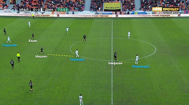 Первый же момент, когда «Динамо» удалось провести позиционную атаку: Скопинцев заставил Железнова опуститься ниже, из-за этого Бикфалви поднимается к Фернандесу, Мишкич – к Норманну. Гладышев смещается в центр и получает свободное пространство.
