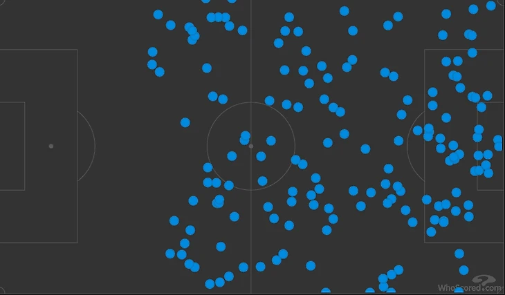 За первые полчаса игры у «Динамо» не было ни одного удара по воротам и даже ни одной атаки, дошедшей хотя бы до чужой трети поля. Вот карта касаний гостей до 30 минуты.