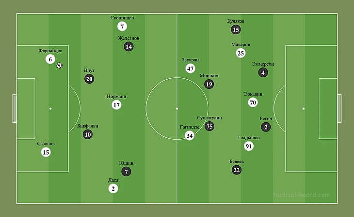 После тройной замены Гончаренко перешёл на более атакующую игру. Схема команды не поменялась, но на поле появились более свежие фланговые игроки. Вместо Егорычева, который имел гибридную роль, вышел Юшин. Раньше Александр играл только в атакующей тройке, поэтому такое решение само по себе было достаточно рискованным и сразу же отразилось на игре.