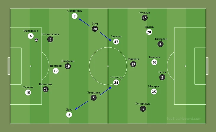 Егорычев и Влут всё так же переключались между двумя игроками: уходили в центр при длинной передаче и выдвигались вперёд в случае короткого розыгрыша через фланг.