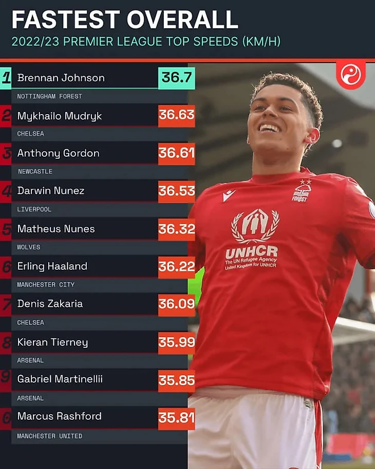 Аналитическая компания Squawka предоставила официальные данные по десяти самым быстрым игрокам АПЛ. Так стало известно о том, что хавбек «Форест» Бреннан Джонсон разогнался в сезоне-2022/2023 до 36,7 км/ч.