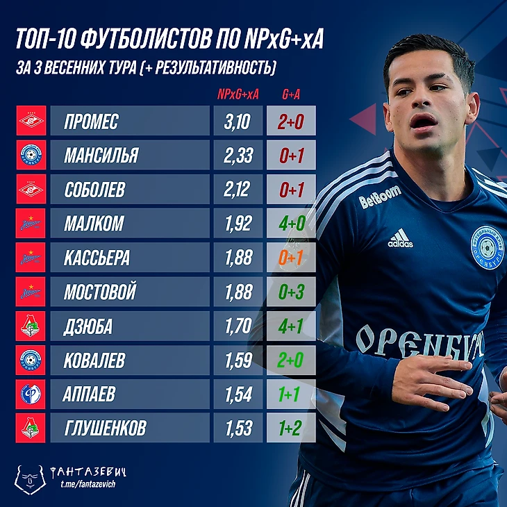Топ-10 футболистов по xG+xA (вероятные голы и ассисты) за 3 весенних тура