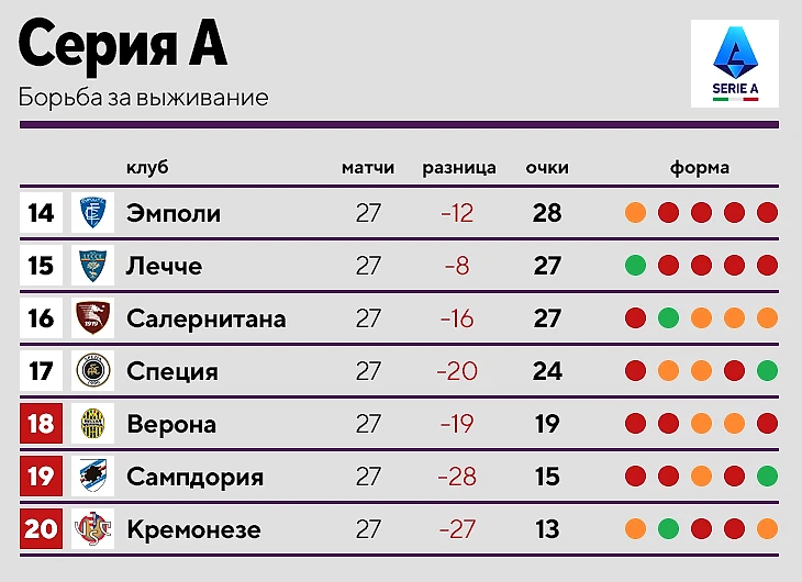 • В Италии, кажется, наименьшая борьба за выживание –«Кремонезе» и «Сампдория» на дне, «Верона» отстает от «Специи» на 5 очков.