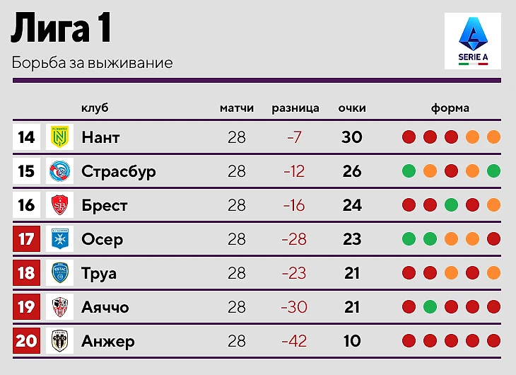 • Из Лиги 1 вылетают сразу четыре команды – одна из них точно «Анжер». У команды 2 очка в 20 последних матчах.