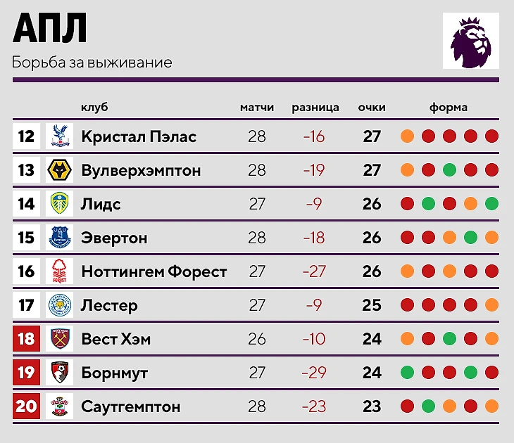 Вот так выглядит нижняя часть таблицы в топовых лигах. Для удобства мы указали и форму в последних пяти матчах (справа – самая свежая игра).