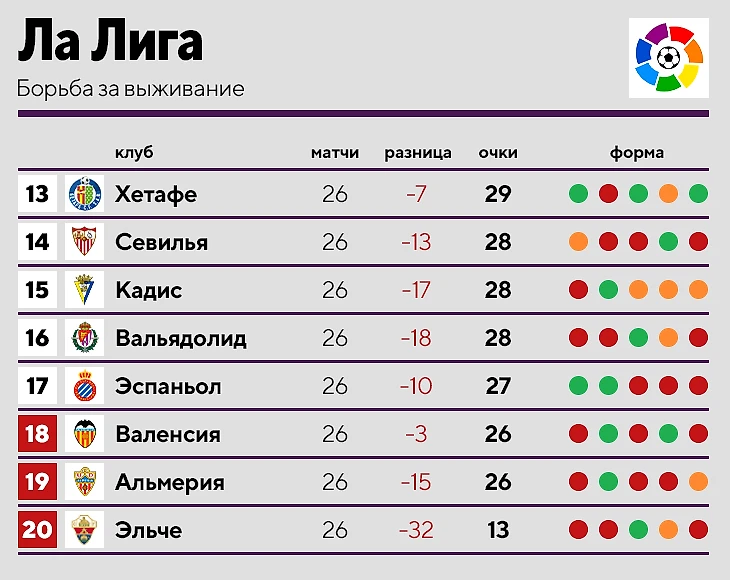 • «Эльче» уже не спасти. Компанию ей скорее всего составят «Вальядолид» (играть с «Реалом», «Барсой», «Атлетико» и «Вильярреалом») и «Альмерия» («Реал», «Сосьедад», «Атлетико»).