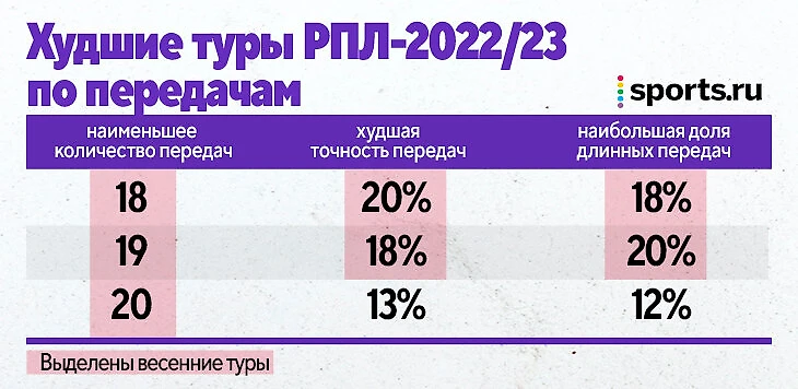 Весной точность передач упала у 13 команд РПЛ, а доля длинных передач возросла у 12.