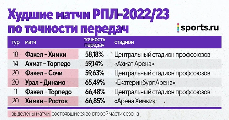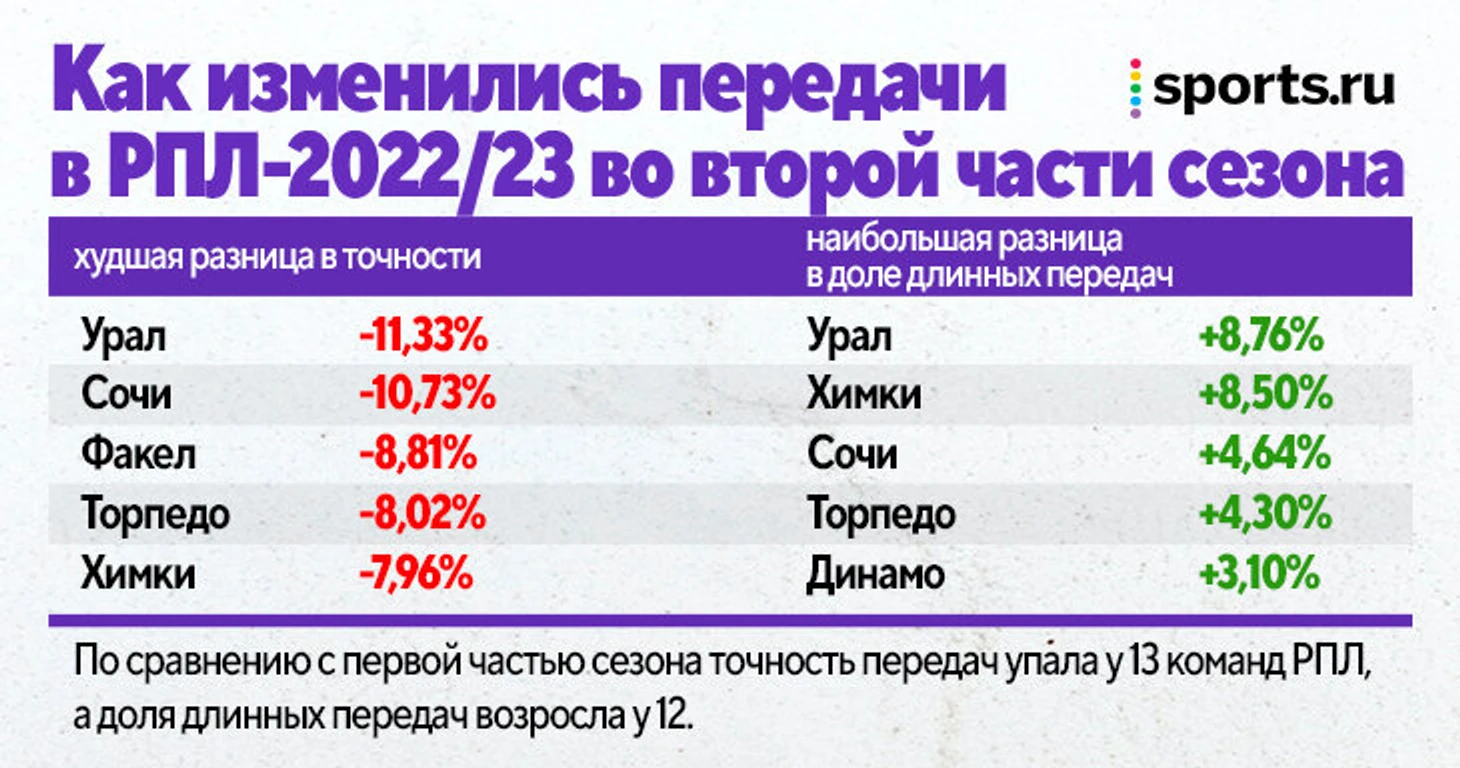 Конечно, очень важен контекст. Во-первых, во второй части сезона прошло всего три тура. Во-вторых, на показатели нескольких команд сильно влияют детали. Например, «Сочи» сменил Вадима Гаранина на Курбана Бердыева – точность передач упала бы и при нормальных полях, потому что это тренеры разного стиля. На точность передач «Локомотива» (-6,57% по сравнению с осенью) сильно повлиял матч с «Ахматом» (1:0), в котором команда Галактионова с 30-й минуты играла вдесятером, а с 59-й – вдевятером (всего 43% точных передач вдевятером).
