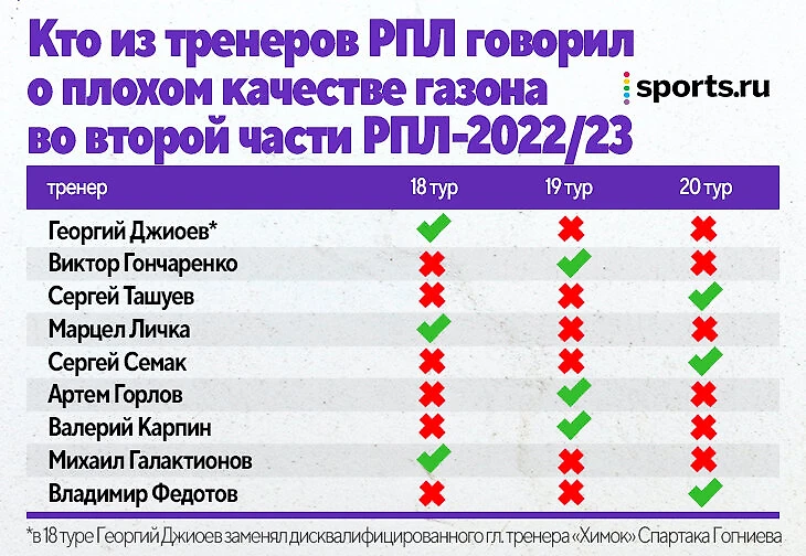 Но другие тренеры РПЛ – целых девять – на послематчевых пресс-конференциях все-таки упоминали «тяжелые поля» и «непростые условия».