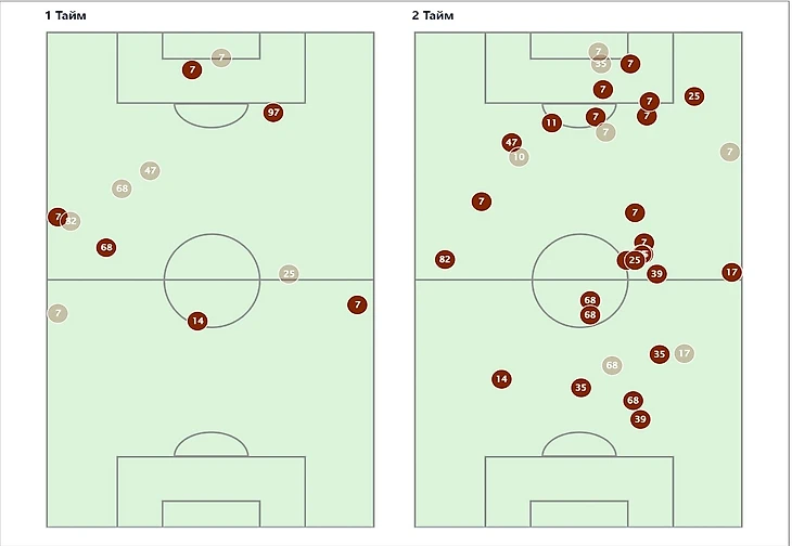 Главная статистическая аномалия весны – «Спартак». По ходу вторых таймов с «Факелом» (2:2) и «Оренбургом» (0:2) Абаскаль тотально упрощал игру. Вот, например, как выглядит карта верховых единоборств «Спартака» в матче с «Факелом».