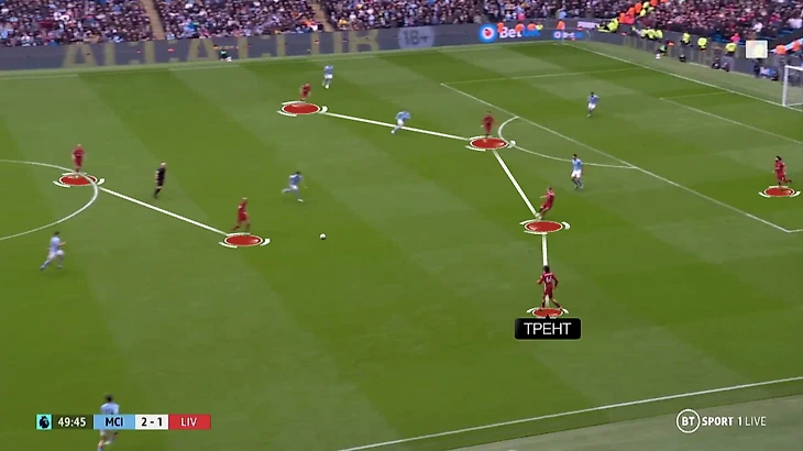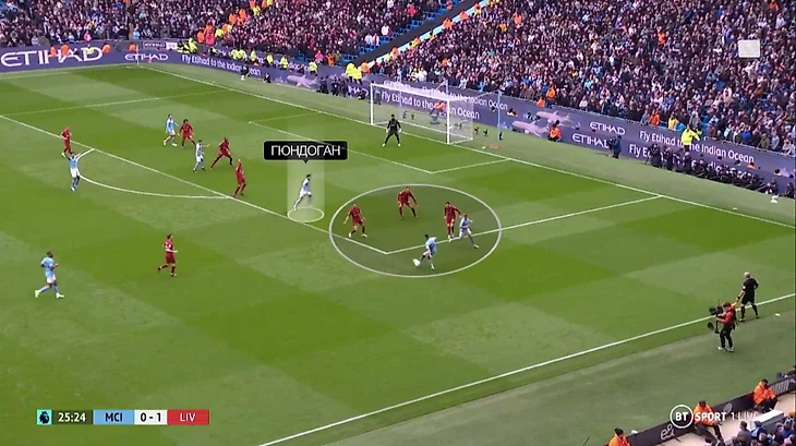 После неудачных попыток прессинга «Ливерпуля» эпизоды развивались по двум сценариям. Первый – «Сити» пытается сразу наказать на пространстве. Второй – «Сити» не спешит и замедляет атаку, а «Ливерпуль» откатывается в средний блок.
