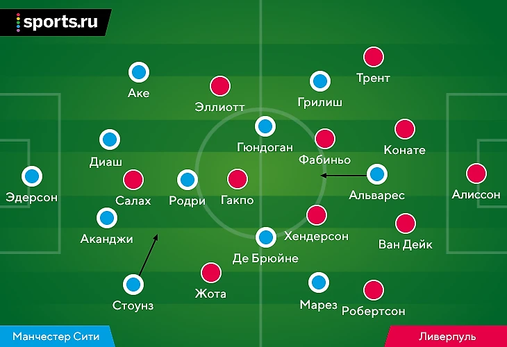 На игру с «Сити» Клопп отошел от привычного варианта: «Ливерпуль» прессинговал в схеме 4-2-3-1. Атакующую четверку из Салаха, Эллиотта, Гакпо и Жоты страховала пара опорников Хендерсон – Фабиньо: