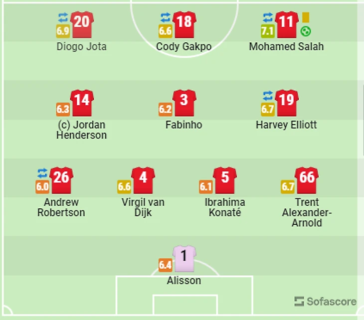 Юрген Клопп вернулся к варианту с Коди Гакпо в центре нападения, как было в матче с «Борнмутом» (1:0). Джордан Хендерсон вышел играть левого центрального полузащитника. Диогу Жота расположился на позиции левого вингера. Остальные позиции остались без изменений.