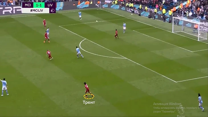 Прессинг соперника на чужой половине поля и в средней трети. «Сити» очень легко проходил давление «Ливерпуля». Засчет быстрого движения мяча как по горизонтали, так и по вертикали «горожане» без проблем переходили в среднюю и финальную трети. Во втором голе «Сити» слишком смелая позиция Трента в прессинге на чужой половине поле. «Сити» успешно перешёл в среднюю треть поля с ситуацией 4v3 в передней линии.