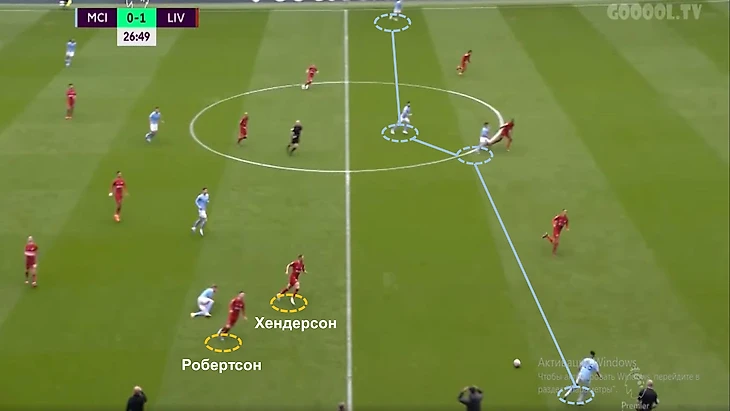 В иных случаях, «Ливерпуль» проходил прессинг соперника короткими/средними передачами, через игру на третьего, стягивая давление «Сити» на фланг.