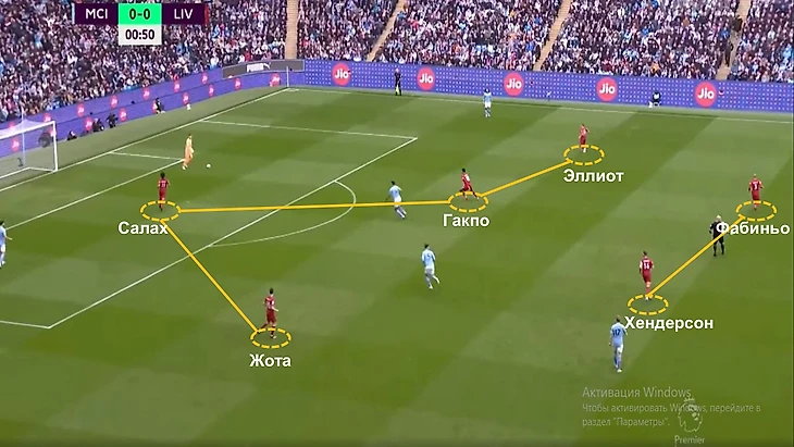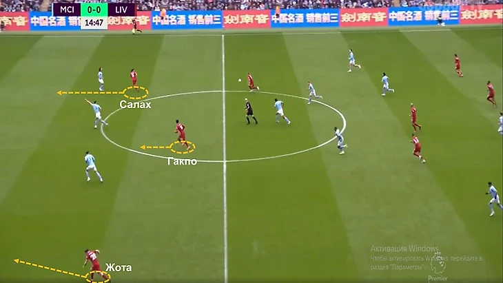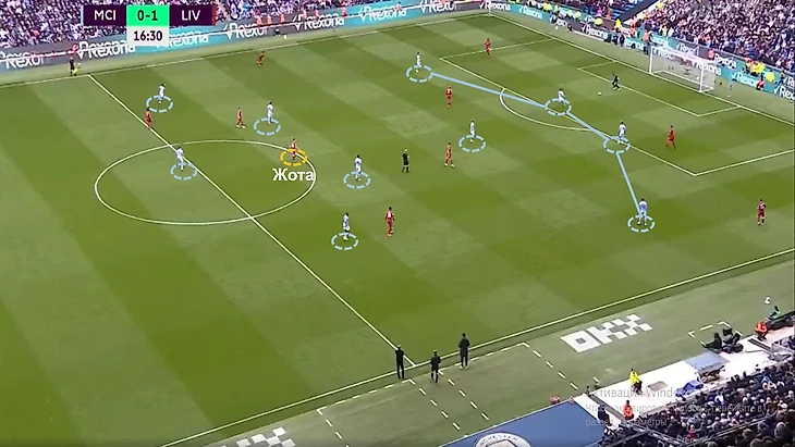 Быстрые вертикальные атаки/контратаки. Единственный гол «Ливерпуля» был создан благодаря растягиванию структуры прессинга соперника на себя, создав ситуацию для открывания Диогу за спину высокой линии обороны «Сити». Тут также сработал и выход из-под давления.