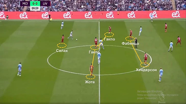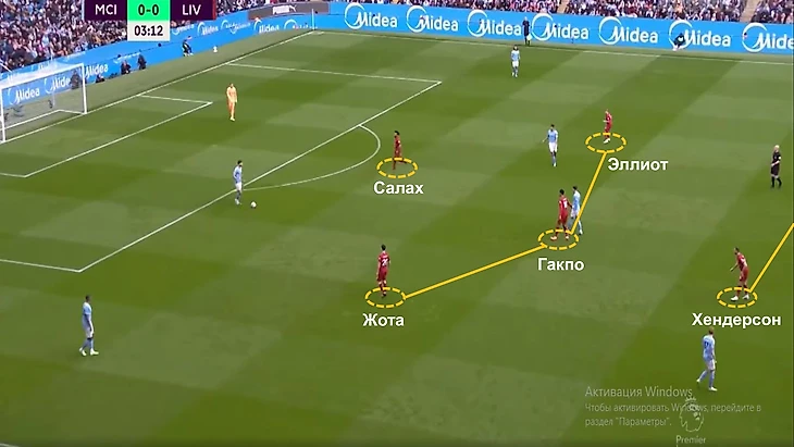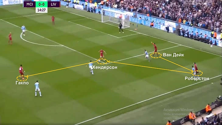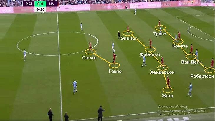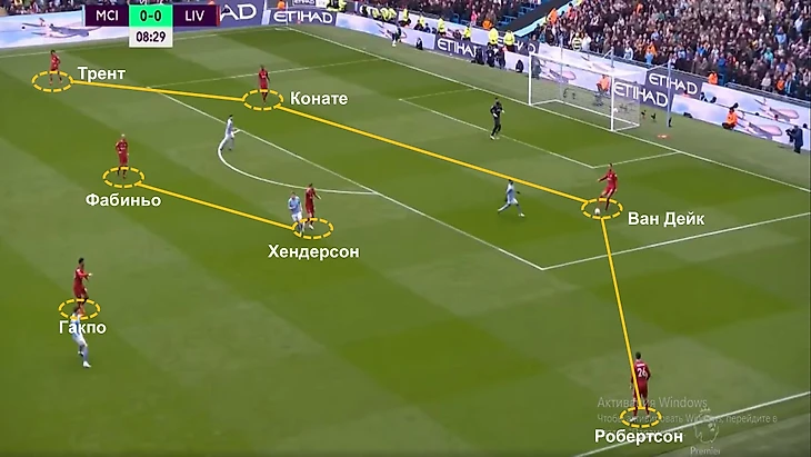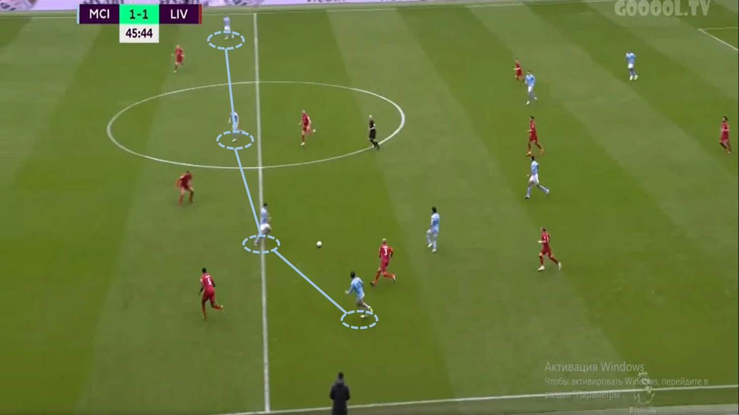 Выход из-под прессинга. Команда вытягивала на фланг структуру прессинга «Сити», что позволяла хоть и с риском, но выходить через короткие/средние передачи. Только в случае отсутствия доступных адресатов Конате, Алиссон и Ван Дейк выносили мяч вперёд длинной передачей.