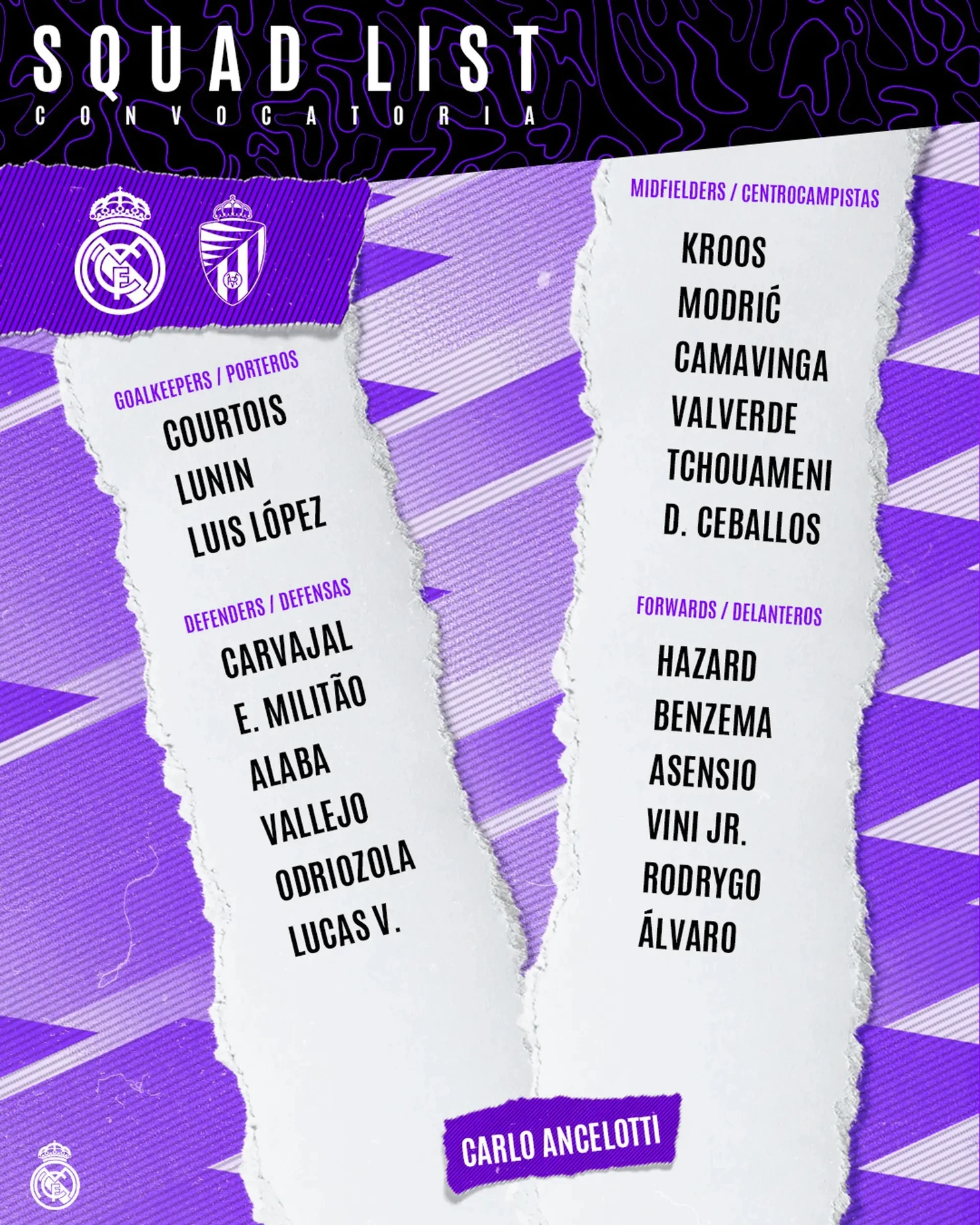Вот заявка Карло Анчелотти на игру: