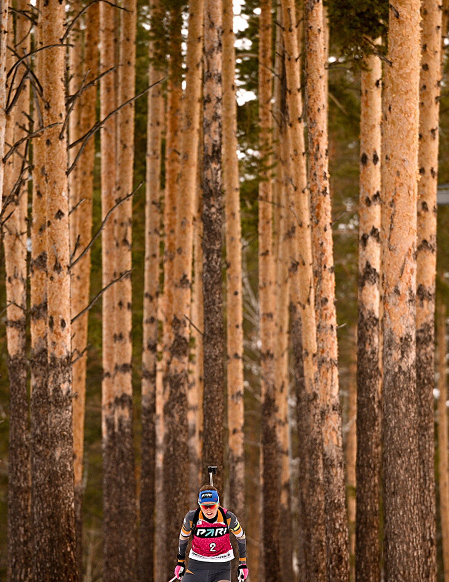 11 марта. Здесь тоже акцент не на спортсмене. Деревья, деревья, снова деревья и биатлонистка Виктория Сливко.