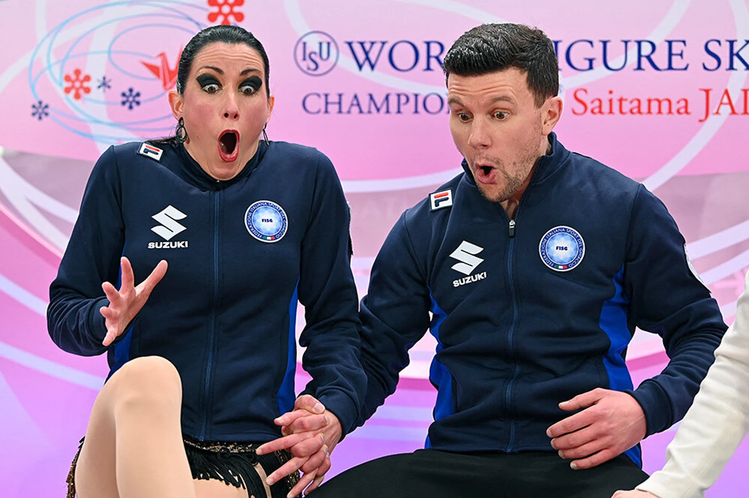24 марта. Огненная реакция итальянцев Шарлен Гиньяр и Марко Фаббри на оценки после произвольного танца. Серебряная медаль ЧМ – впервые в карьере.