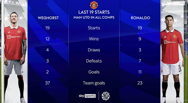 Роналду, за этот же период, помог «Юнайтед» выиграть всего девять игр, в то время как команда забила лишь 23 мяча.