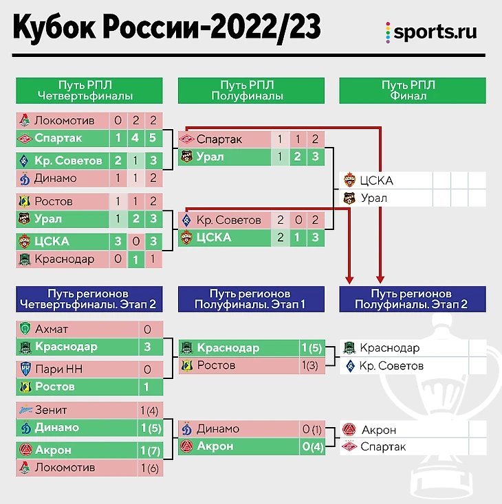 Сетка Кубка России: где теперь «Спартак», «Краснодар» и «Акрон»?