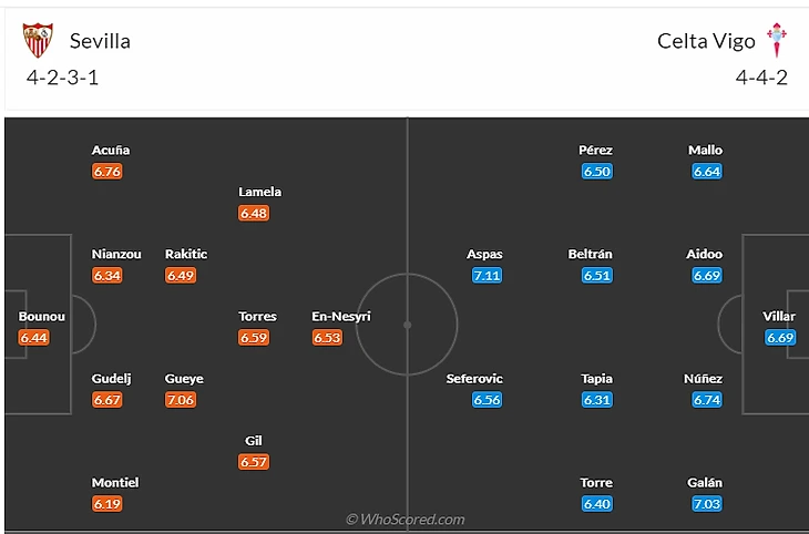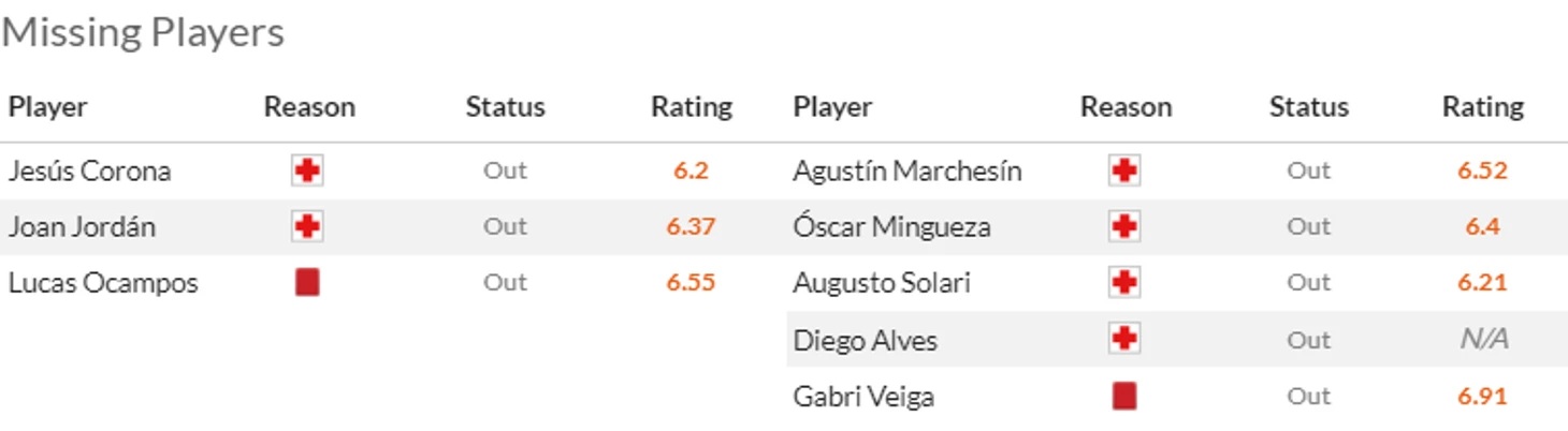 Кроме вратаря не полетят в Севилью травмированные Мингеса(5,5) с Солари(6,5) и перебравший карточек Вейга(5,5). А у хозяев из-за дисквалификации пропустит сегодняшнюю игру Лукас Окампос(8,5)