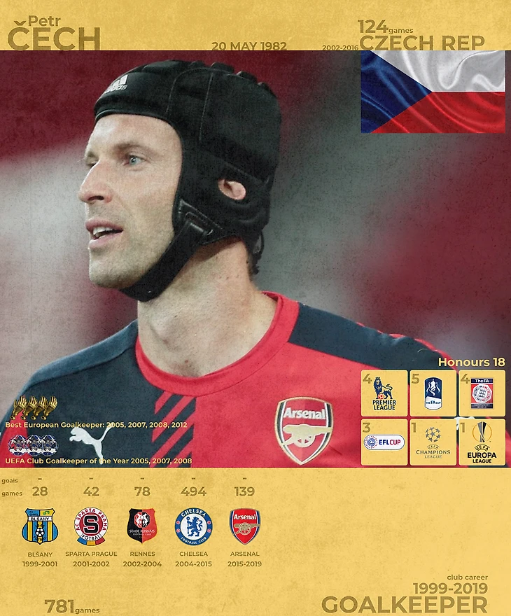 Один из лучших голкиперов в футболе, которого узнает каждый за его легендарную шапочку, позволившая ему продолжить карьеру после жуткой травмы. Чех не сломался и всем всё доказал. Легенда чешского футбола, легенда Челси. Нам остается только порадоваться за него и посмотреть в статистику.