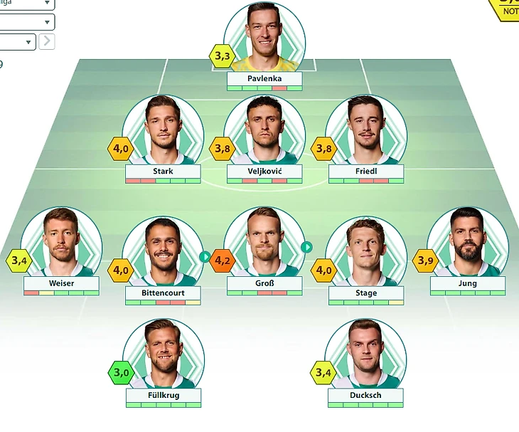 «Вердер»:Павленка – Пипер, Штарк, Фридль – Вайзер, Биттенкур, Гросс, Стаге, Юнг – Фюллькруг, Дукш