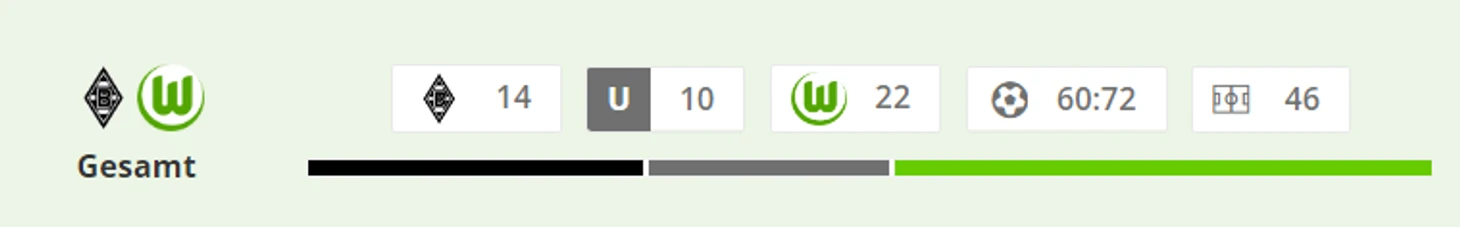 «Вольфсбург» в своей истории Бундеслиги не выигрывал так часто ни у одного другого клуба, как у «Боруссии М» (22 раза в 45 матчах). В последних шести дуэлях в чемпионате «жеребята» одержали две победы и четыре ничьи – впервые «Боруссия М» осталась непобежденной против «волков» шесть раз подряд.