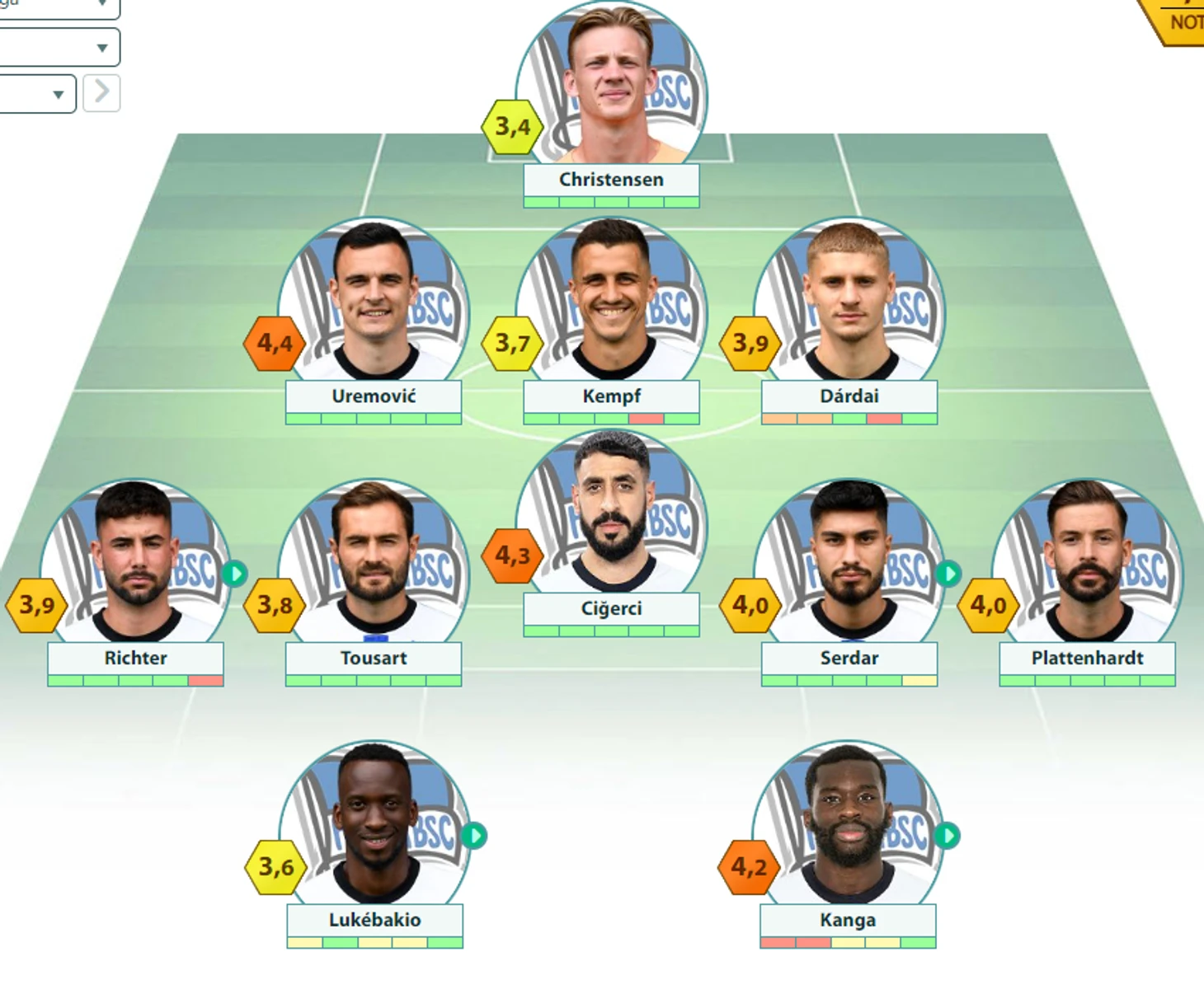 «Герта»: Кристенсен – Уремович, Кемпф, Дардаи – Рихтер, Тусар, Джигерджи, Сердар, Платтенхардт – Лукебакьо, Нганкам