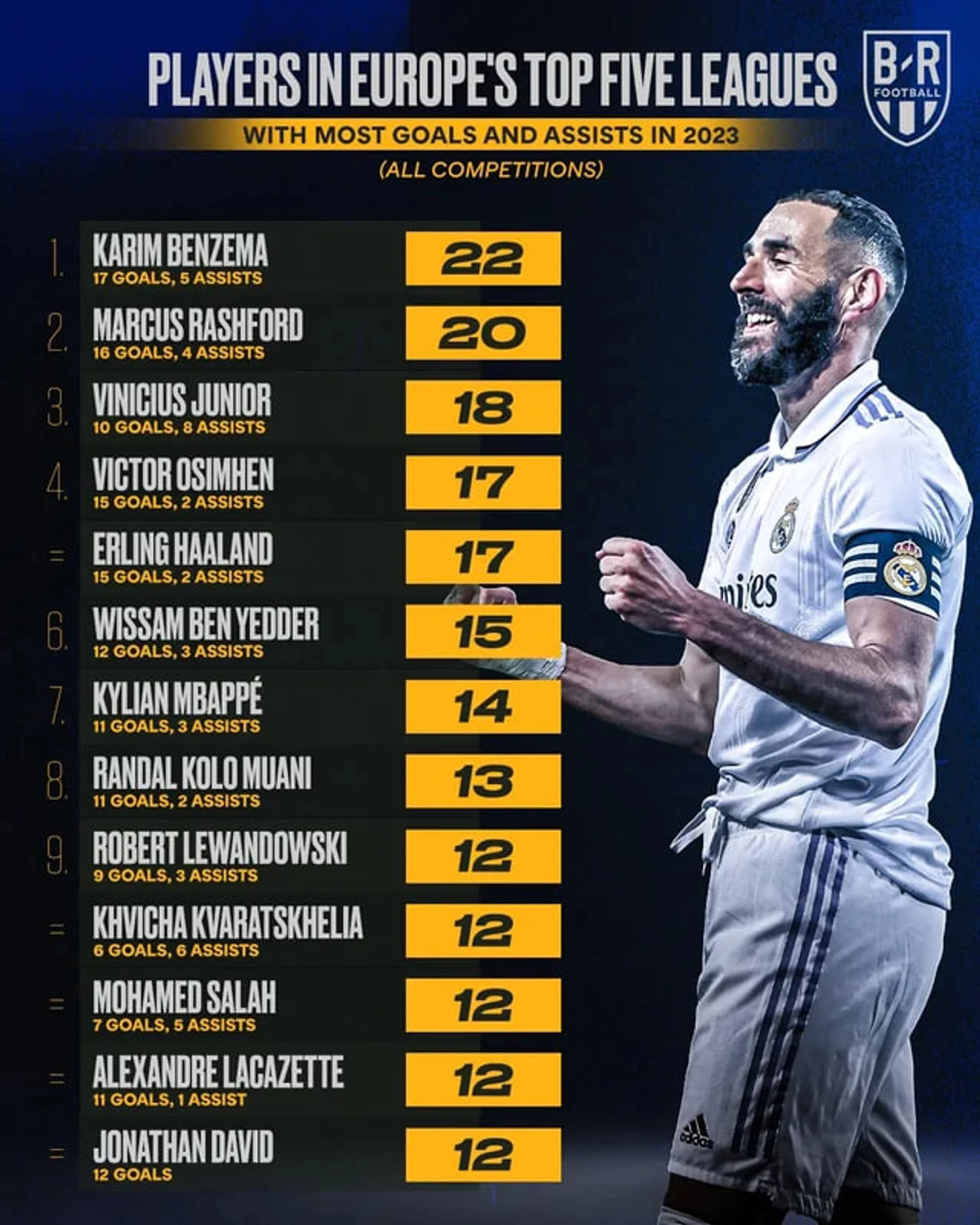 Спортивный сайт Bleacher Report Football подсчитал, кто по состоянию на сегодня является самым результативным игроком в 2023 году в топ-5 лиг Европы. Довольно предсказуемо им стал представитель «Мадрида» Карим Бензема − 17 голов и 5 голевых передач.