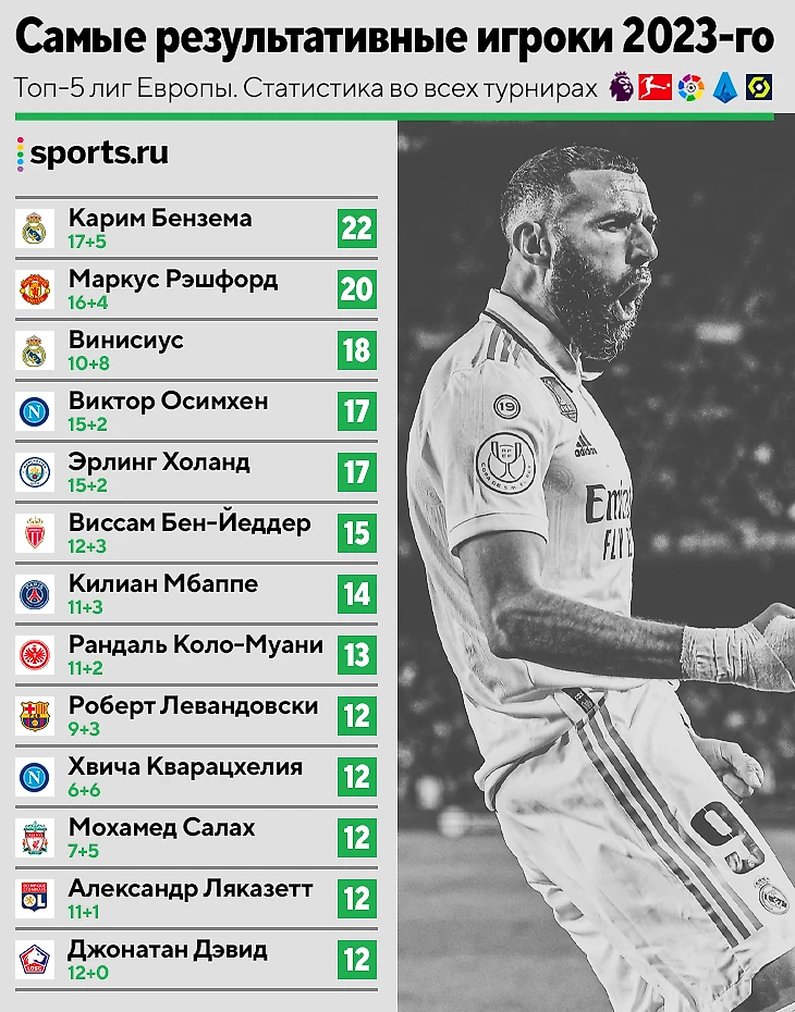 Бензема – самый результативный игрок 2023-го. За 4 дня обогнал Холанда, Рэшфорда и Осимхена