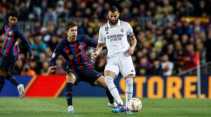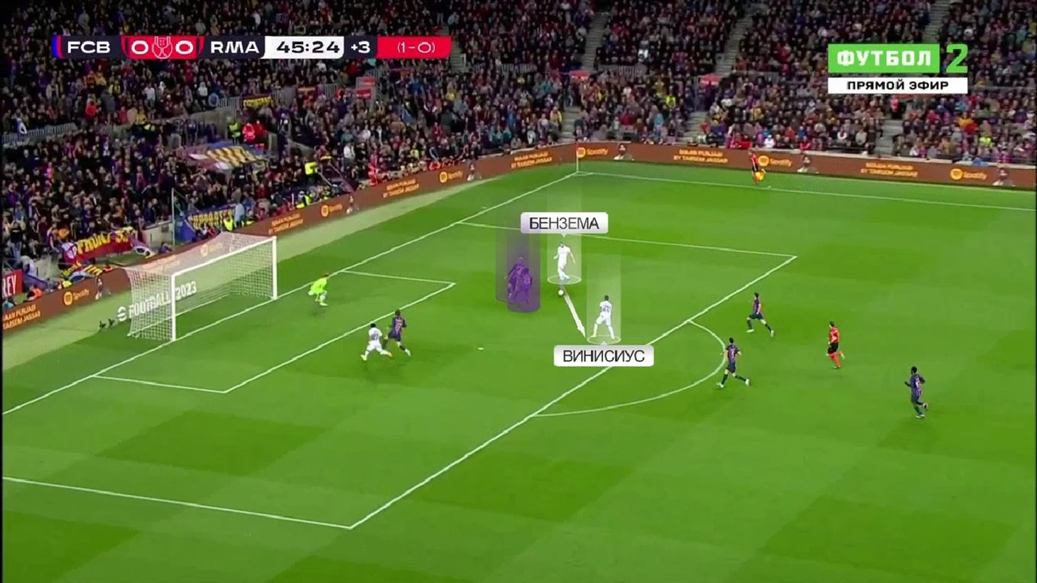 Почти сразу же «Мадрид» удвоил преимущество. Лука Модрич получил мяч на правом фланге, ушёл от Гави и Роберто и выкатил свободному перед штрафной Бензема. Блестяще сыграл Родриго – рывком увёл за собой Кунде, чтобы Бензема оказался без опеки: