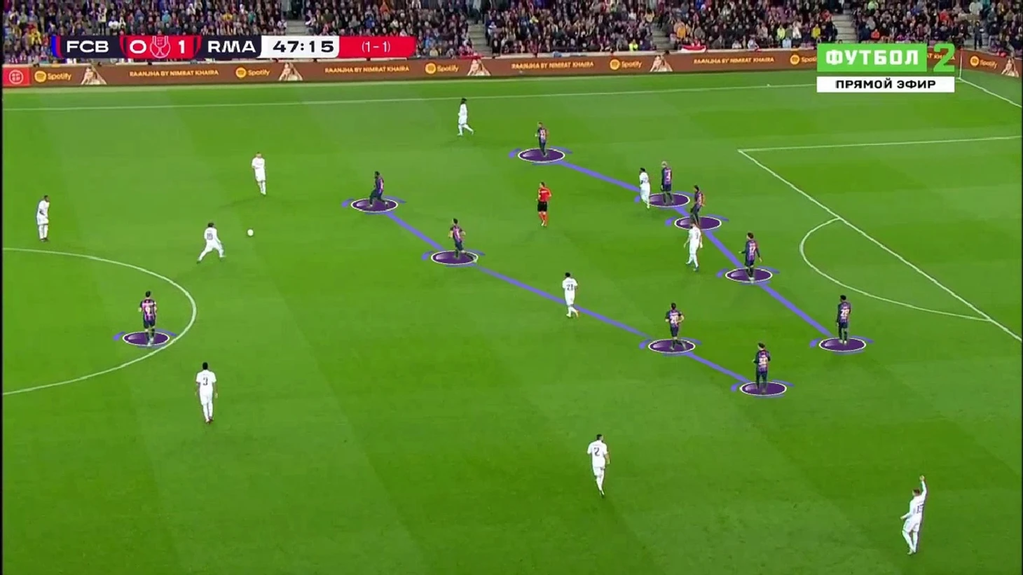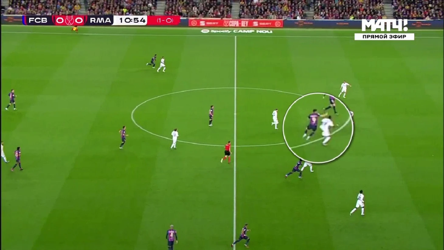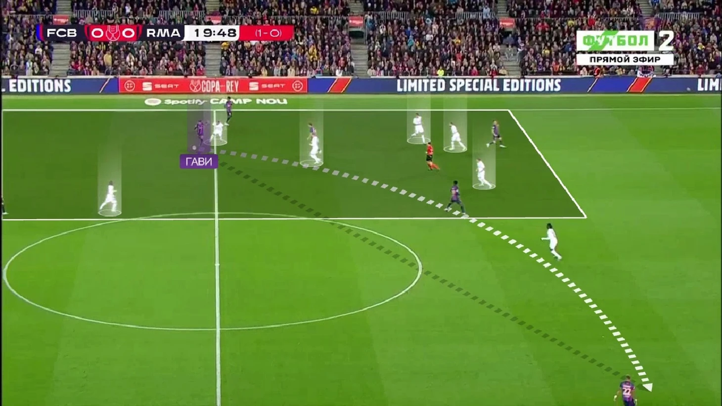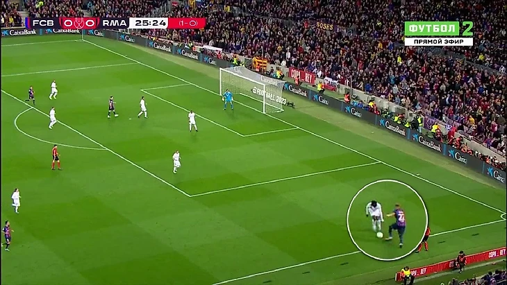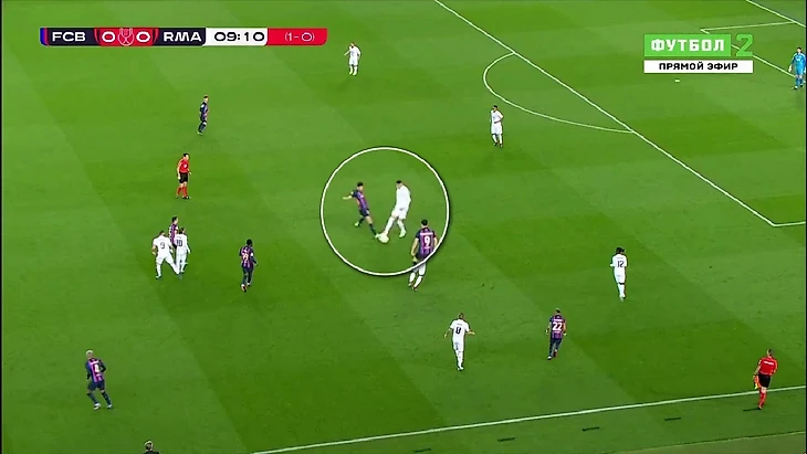 По ходу первого тайма «Барса» при игре с мячом стремилась нагружать левый фланг и стягивать туда «Мадрид», чтобы после перевести мяч направо и создать там ситуацию 1-в-1. Ход хорошо знакомый и «Барселона» им овладела чуть ли не сразу, после назначения Хави. Вот и в Класико ситуация из раза в раз повторялась.