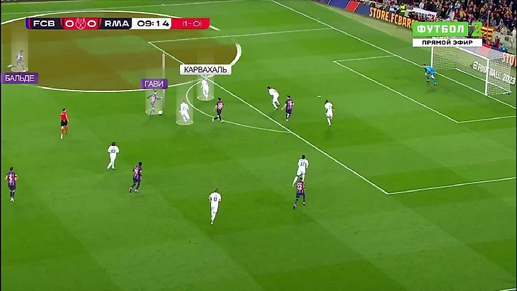 Первый гол «Мадрида» – очень показательный, потому что родился из ситуации, где «сливочные» легко могли пропустить, но в итоге наказали сами. Началось всё с того, что Бальде в очередной раз получил пространство слева, потому что Родриго не вернулся, а Карвахаль действует по Гави: