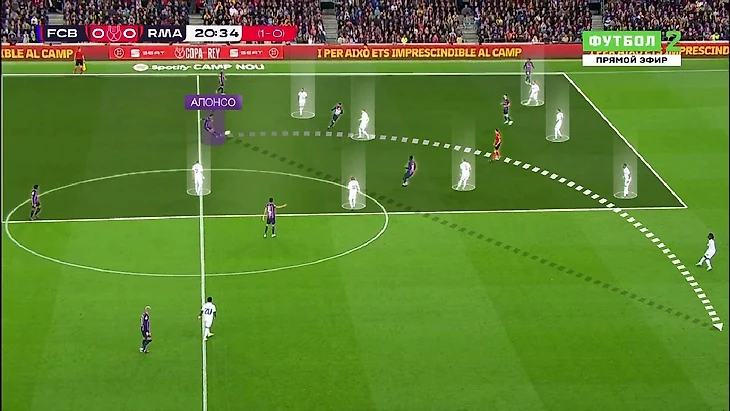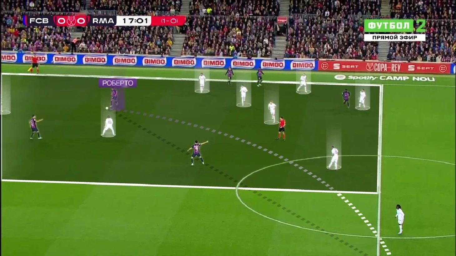 Скорее всего Карло рассчитывал, что этот ход раскачает игру и принесёт моменты в обе стороны – такой рисунок игры удобен «Реалу» и раскрывает уникальные качества этой команды, но есть одно «но»: мы не видели ничего подобного в первом тайме. Алехандро Бальде постоянно получал кучу пространства на левом фланге, но «Мадрид» не отвечал атаками через высокую позицию Родриго – движение в этой зоне было в основном односторонним. Редкий пример такой атаки в исполнении «сливочных» – Левандовский теряет мяч и Вальверде сразу же делает пас на Родриго, который остался высоко:
