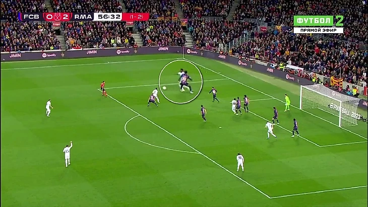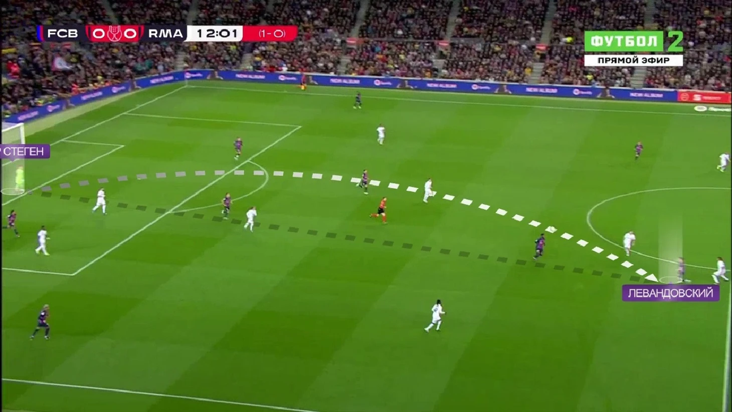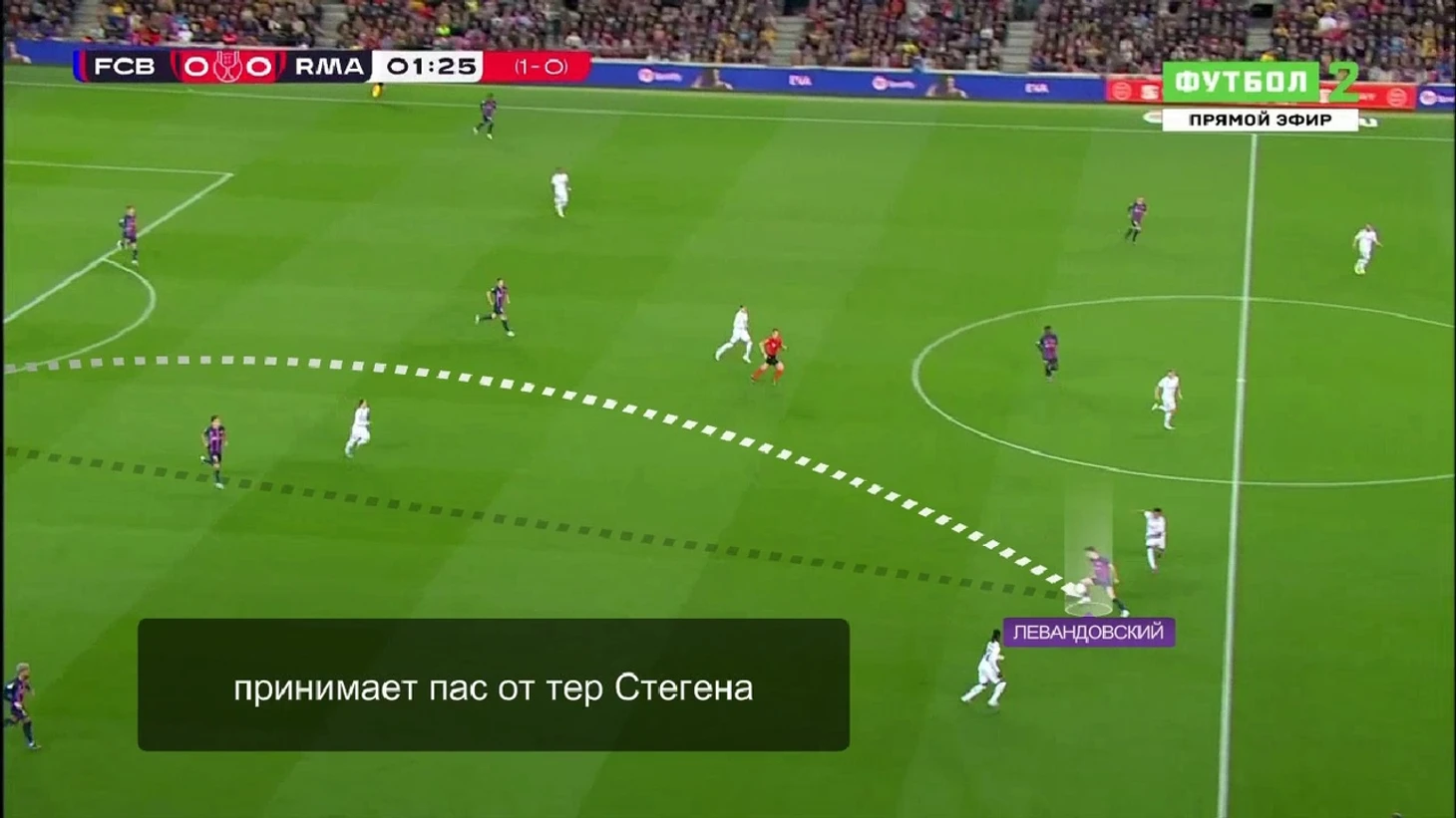 Какой-то из флангов у «Барселоны» неизменно оставался свободным – Камавинга не шёл за Араухо, а Карвахаль играл с Гави, а не Бальде. Поэтому у «Барселоны» всегда был вариант с выходом через свободный фланг, но иногда мы могли видеть классику этого сезона – тер Стеген выцеливает Левандовского и поляк цепляется за этот пас: