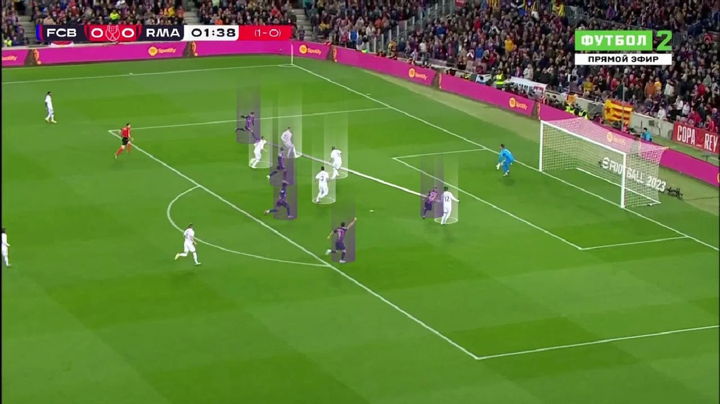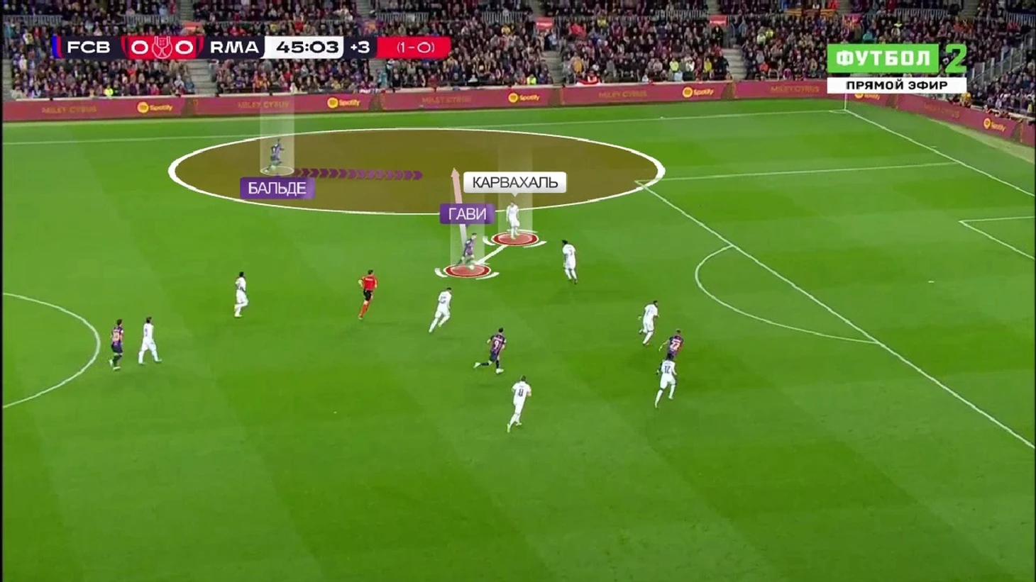 Уже на второй минуте матча произошла ситуация, которую мы будем регулярно наблюдать в первом тайме: после того, Левандовский зацепился за пас тер Стегена, и «каталонцы» вышли в атаку, мы видим, что слева Карвахаль играет по Гави, а Бальде абсолютно один на фланге, потому что Родриго остался в высокой позиции. Араухо делает перевод на Алехандро – это привело к очень опасному моменту: