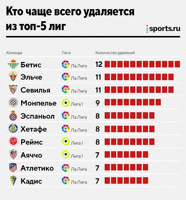 • Ла Лига доминирует в списке (7 клубов из 10), но хватает и французских команд. Чаще всего удаляются футболисты «Бетиса» 12 раз.