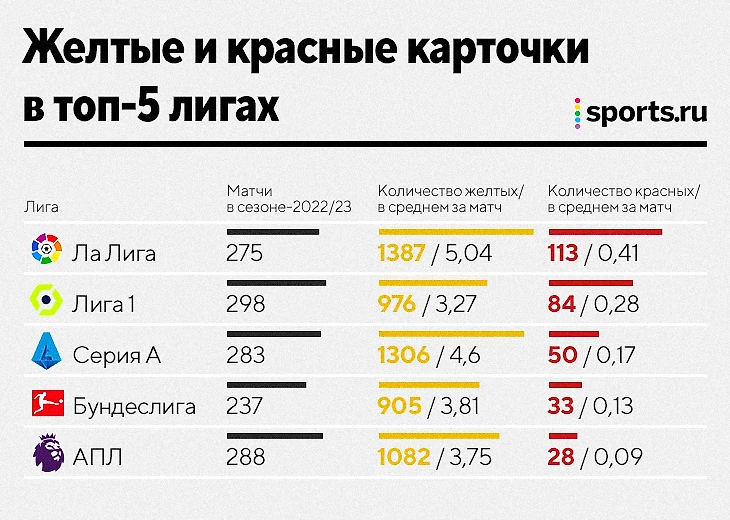 Фернандо прав. В Ла Лиге-2022/23 удаляют намного чаще, чем в АПЛ и других топ-лигах Европы