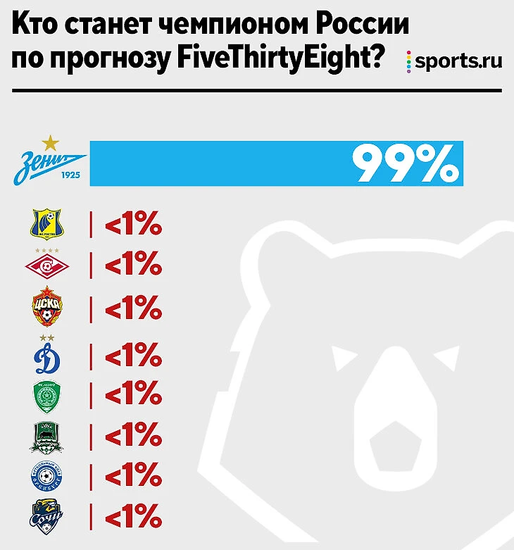 Статистическая модель FiveThirtyEight совсем не верит в конкуренцию в РПЛ: чемпионство «Зенита» оценивается в 99%.