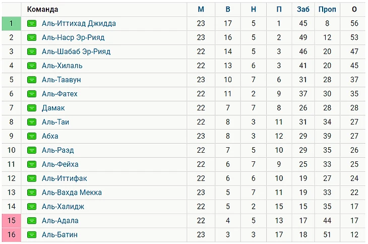 • Спустя 2,5 месяца – то есть сейчас – картина следующая: на первом месте идет «Аль-Иттихад», за ним в трех очках «Аль-Наср». Оба сыграли по 23 матча. «Аль-Шабаб» отстает от «Аль-Насра» на шесть очков, но у него есть игра в запасе.