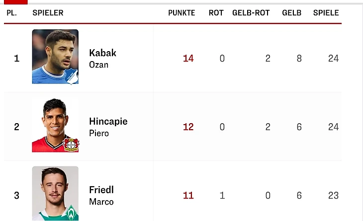 *игрок – кол-во игр – желтые – 1+1 желтые – красные – всего
