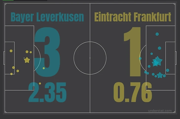 Статистика не подвела и в этот раз. «Байер» ударно начал матч и открыл счет уже на 10-й минуте – Флориан Вирц и Амин Адли разыграли голевую комбинацию, скоростной Адли убежал от защитников «орлов» и забил первый гол в матче. «Айнтрахт» практически сразу попытался ответить: Филипп Макс после точной передачи Аурелио Бута мог сравнять счет, однако Лукаш Градецки парировал удар. Впоследствии у «орлов» было несколько неплохих атак, но второй гол забил снова «Байер»: Мусса Диаби удвоил преимущество после голевой передачи Флориана Вирца. «Айнтрахт» проснулся только в середине второго тайма – Джибриль Соу сократил разрыв в счете, уверенно пробив из центра штрафной. Однако взять очки «орлам» так и не удалось: Сердар Азмун поставил точку в матче на последних минутах, забив гол после длинной голевой передачи Дэйли Синкгравена. Встреча завершилась победой «Байера» со счетом 3:1, что позволило «фармацевтам» обогнать «Айнтрахт» в турнирной таблице и занять шестую строчку.