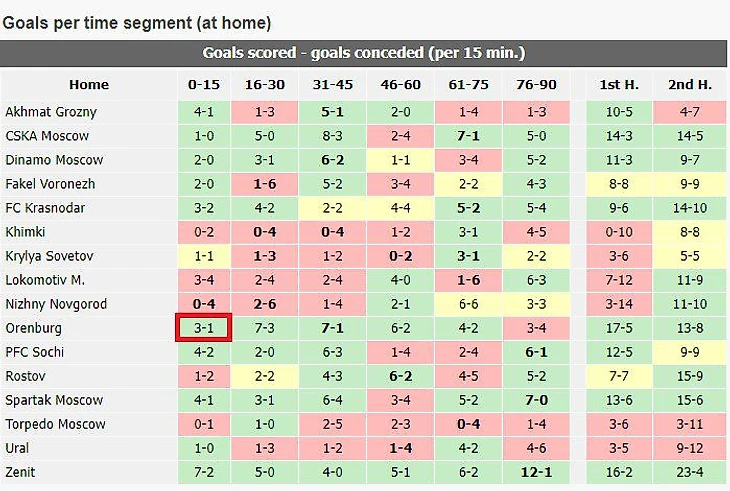1) В первые 15 минут домашних матчей у "Оренбурга" разница мячей всего лишь 3-1. Гораздо красивее цифры с 16-й по 60-ю минуты. То есть в первые 15 минут, когда соперники как раз могли бы оправдывать себя привыканием к газону, никакой большой разницы "Оренбург" не делает. А после 15-й минуты соперники вдруг начинают отвыкать от газона, так получается?